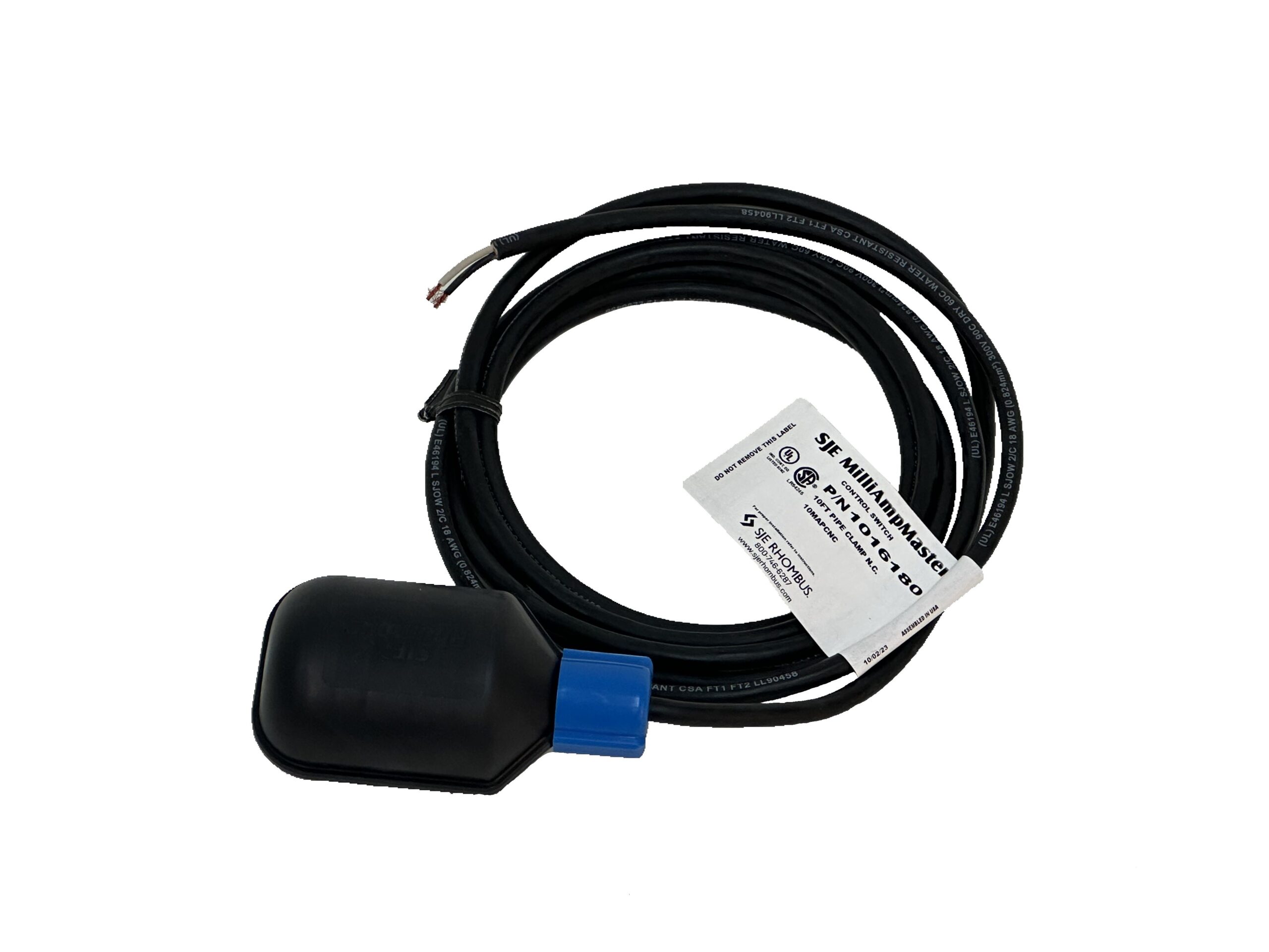 Mechanically-activated control switch designed to activate low current control panels and alarms. This wide-angle or narrow-angle control switch offers reliable low current control for AC and DC applications in water, wastewater, and sewage. The internal switching mechanism has sealed gold cross-point contacts for reliable low current operation. Common applications include PLC (programmable logic controller) panels, IS panels with intrinsically safe barriers, low current solar applications, and other low current control panels and alarms applications. The wide-angle version activates/deactivates approximately 4″ (10.16 cm) above and below horizontal with a 3.5″ (9 cm) tether. The narrow angle version activates/deactivates at approximately 1.5″ (3.81 cm) above and below horizontal with a 3.5″ (9 cm) tether. It is not sensitive to rotation. Normally Open Model (high level) The control switch turns on (closes) when the switch tips above horizontal signaling a high level, and turns off (opens) when the switch drops below horizontal. Normally Closed Model (low level) The control switch turns on (closes) when the switch drops below horizontal signaling a low level, and turns off (opens) when the switch tips above horizontal.